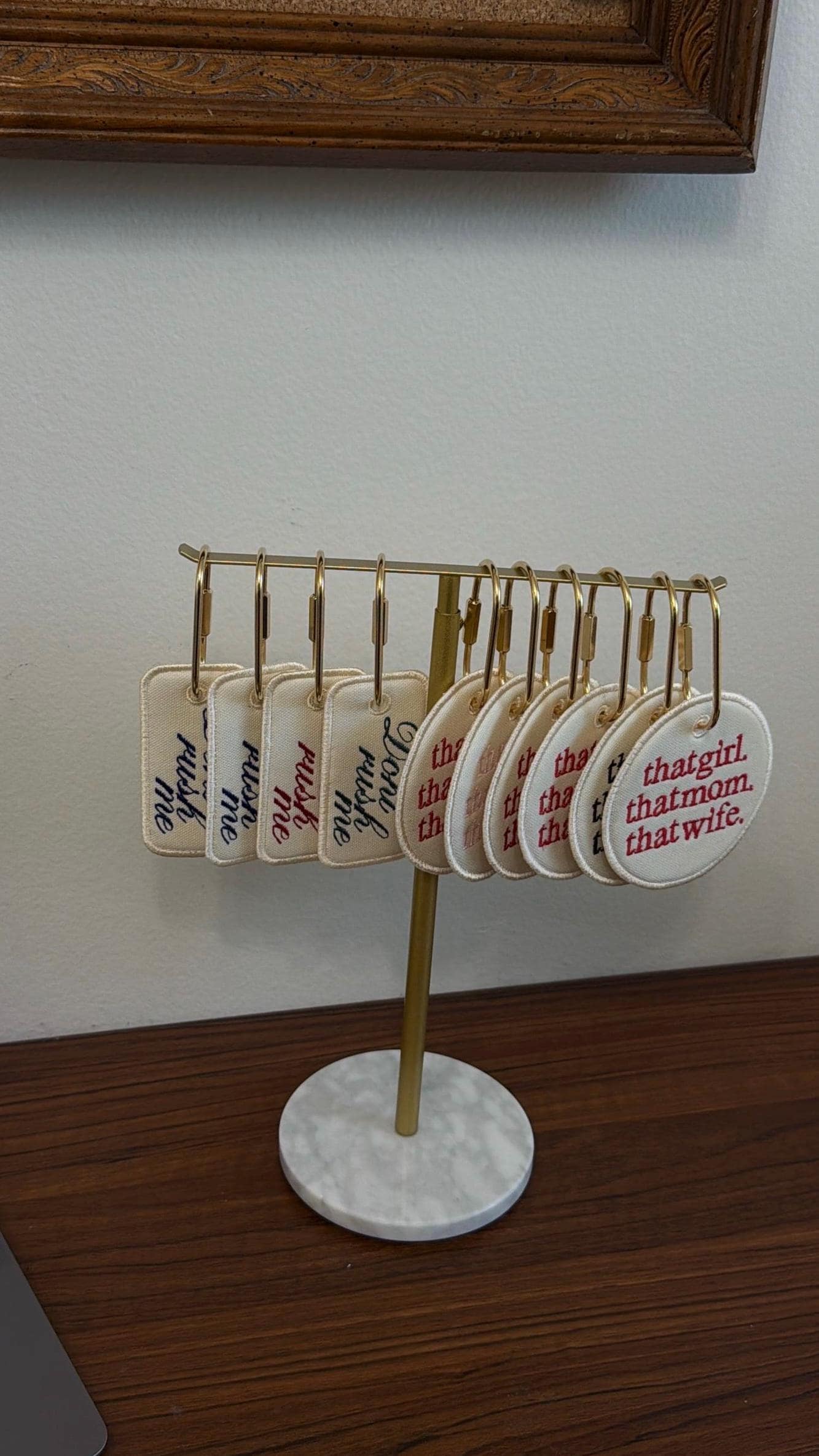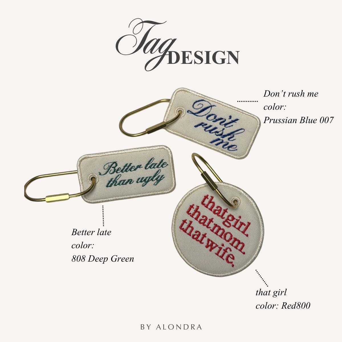 Each tag is stitched on durable canvas with high-quality embroidery and finished with a sturdy metal clasp, so you can use it as a bag tag, luggage tag, or keychain.