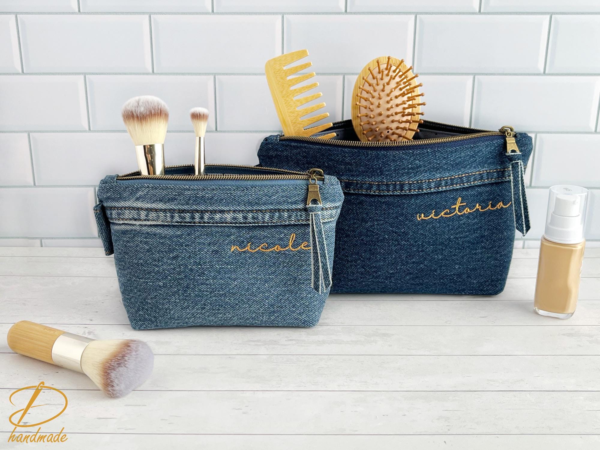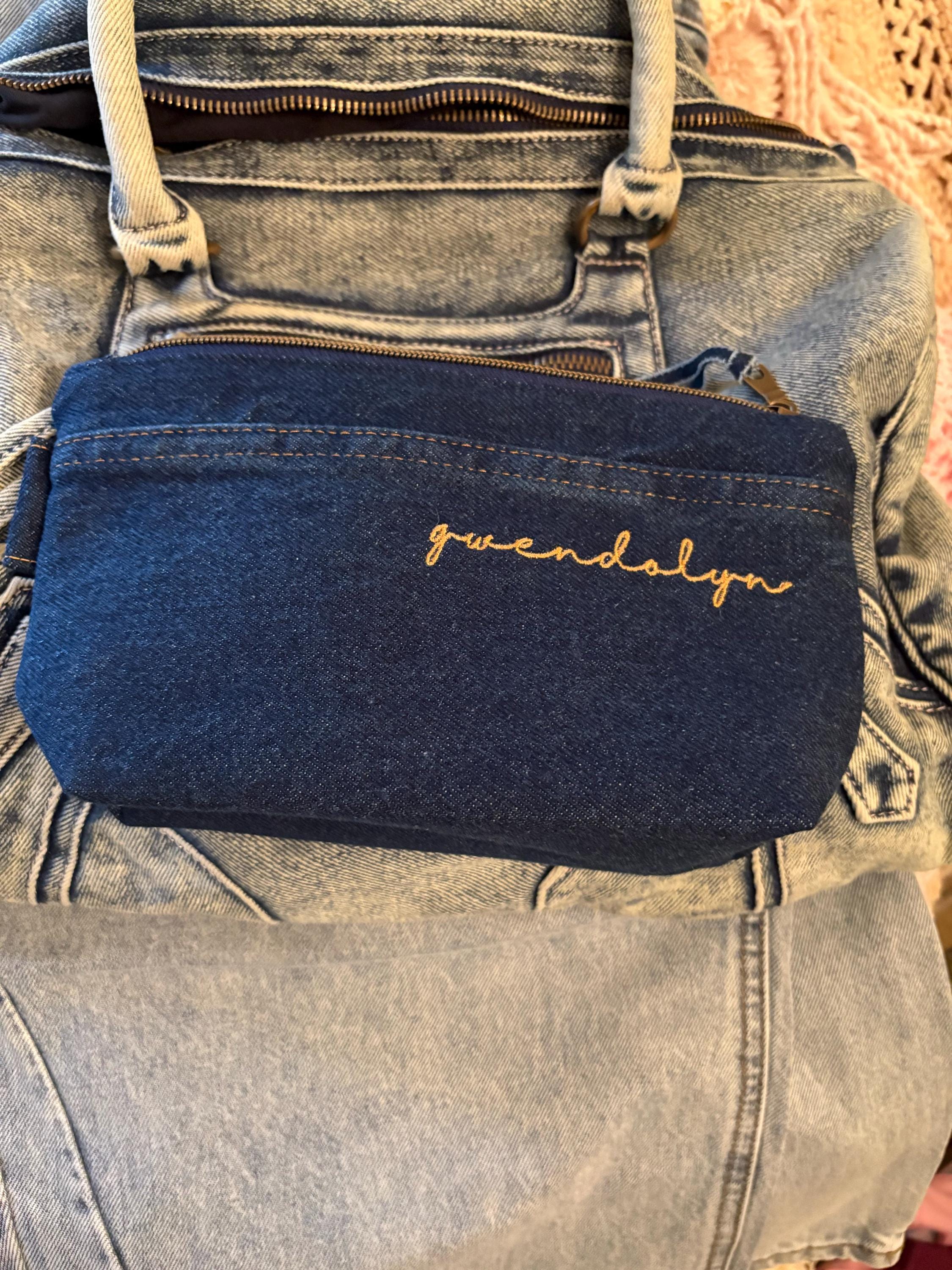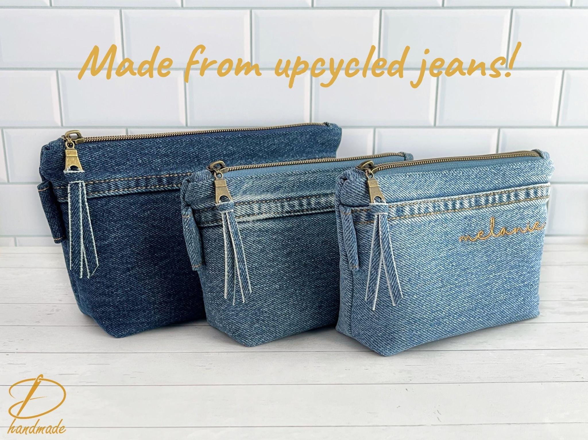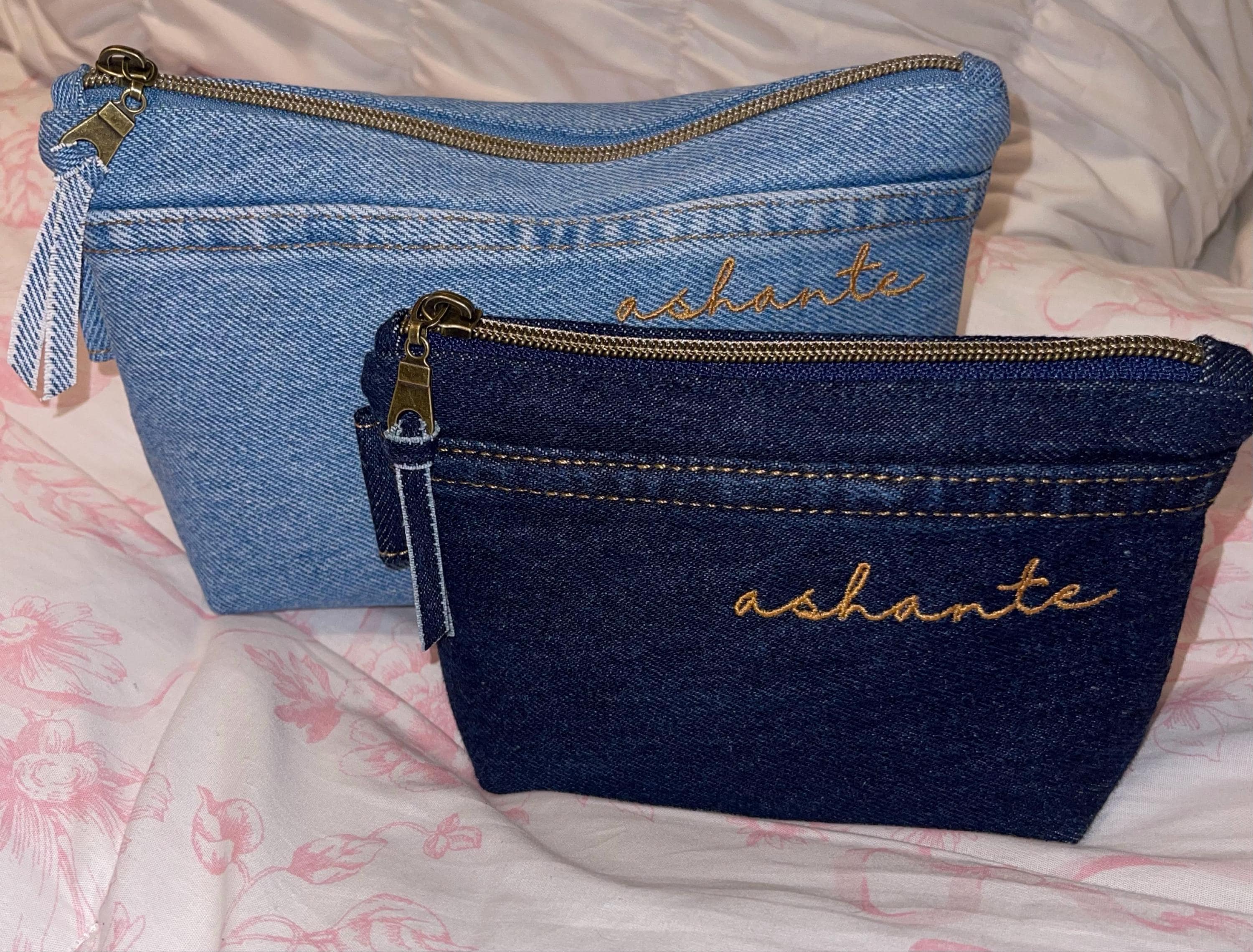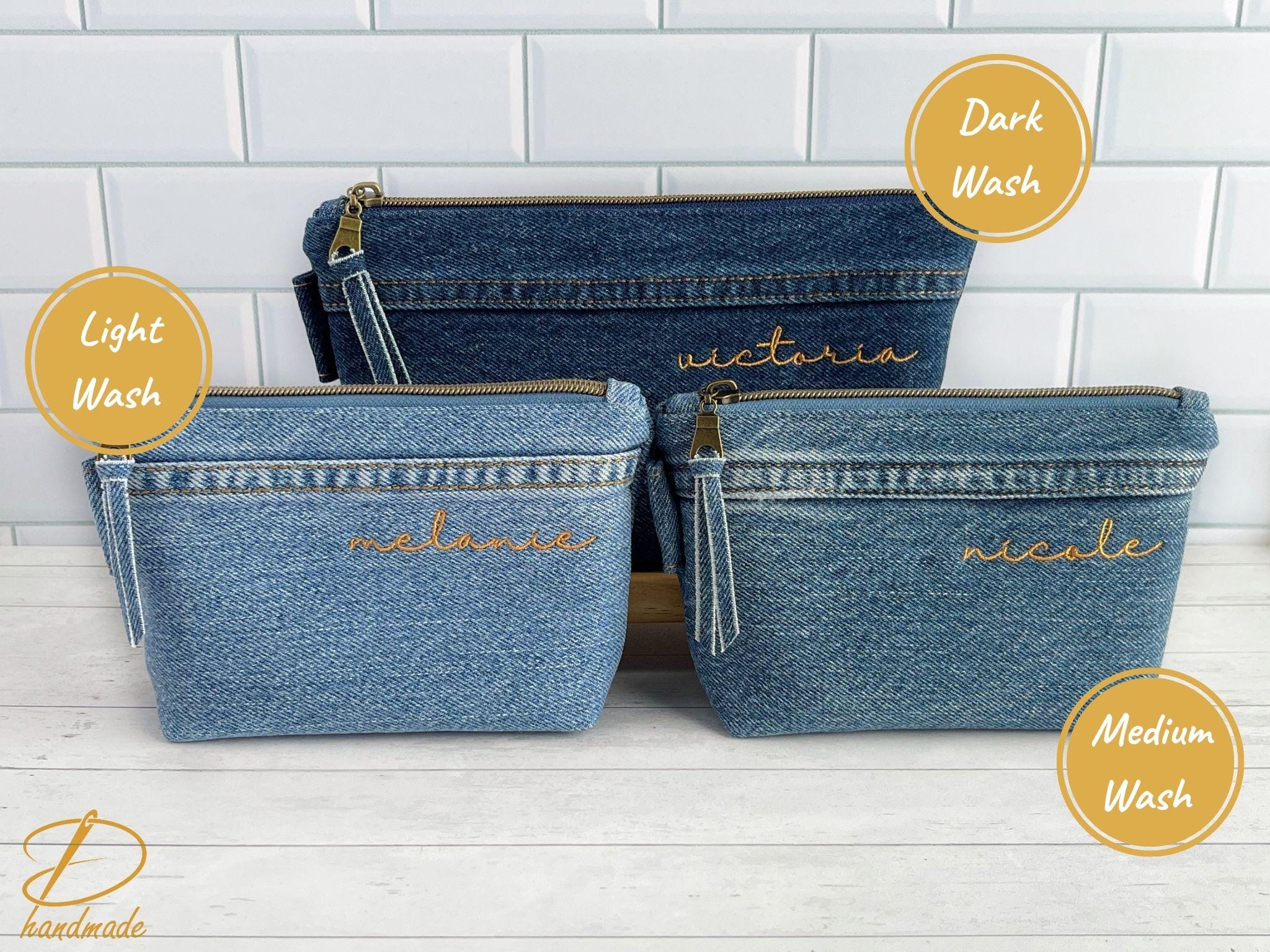 Personalized Upcycled Denim Zipper Pouch: Embroidered Makeup Bag Made From Real Jeans