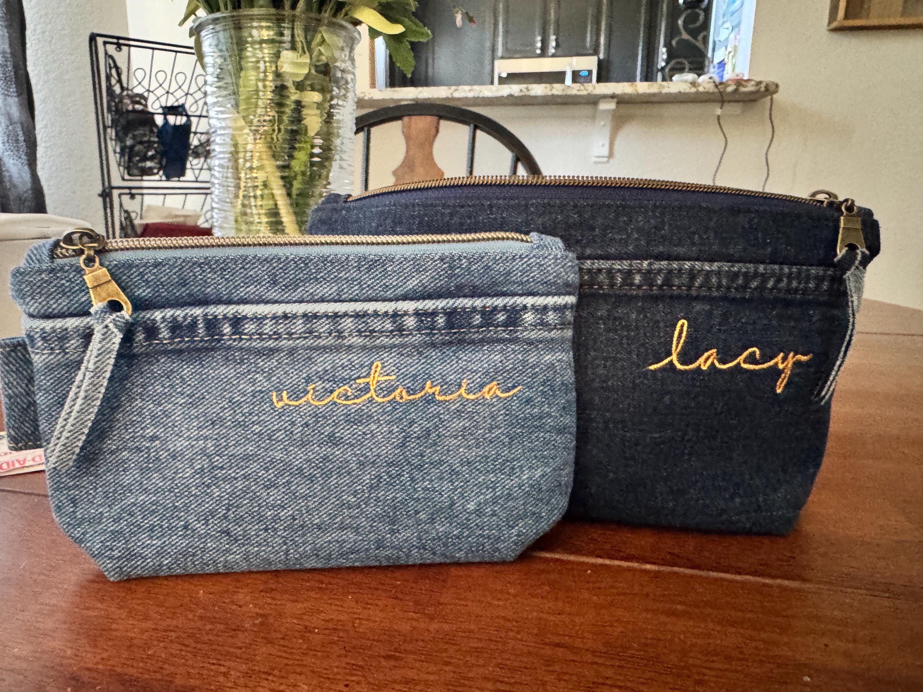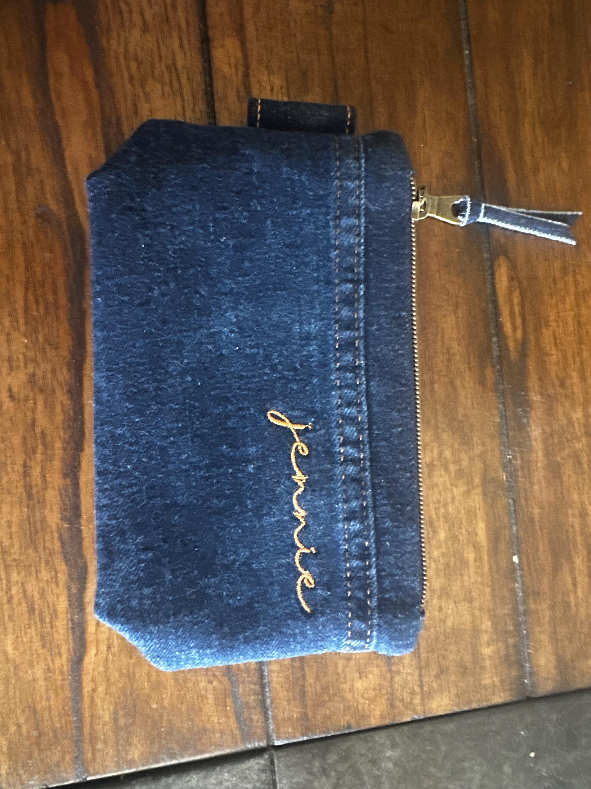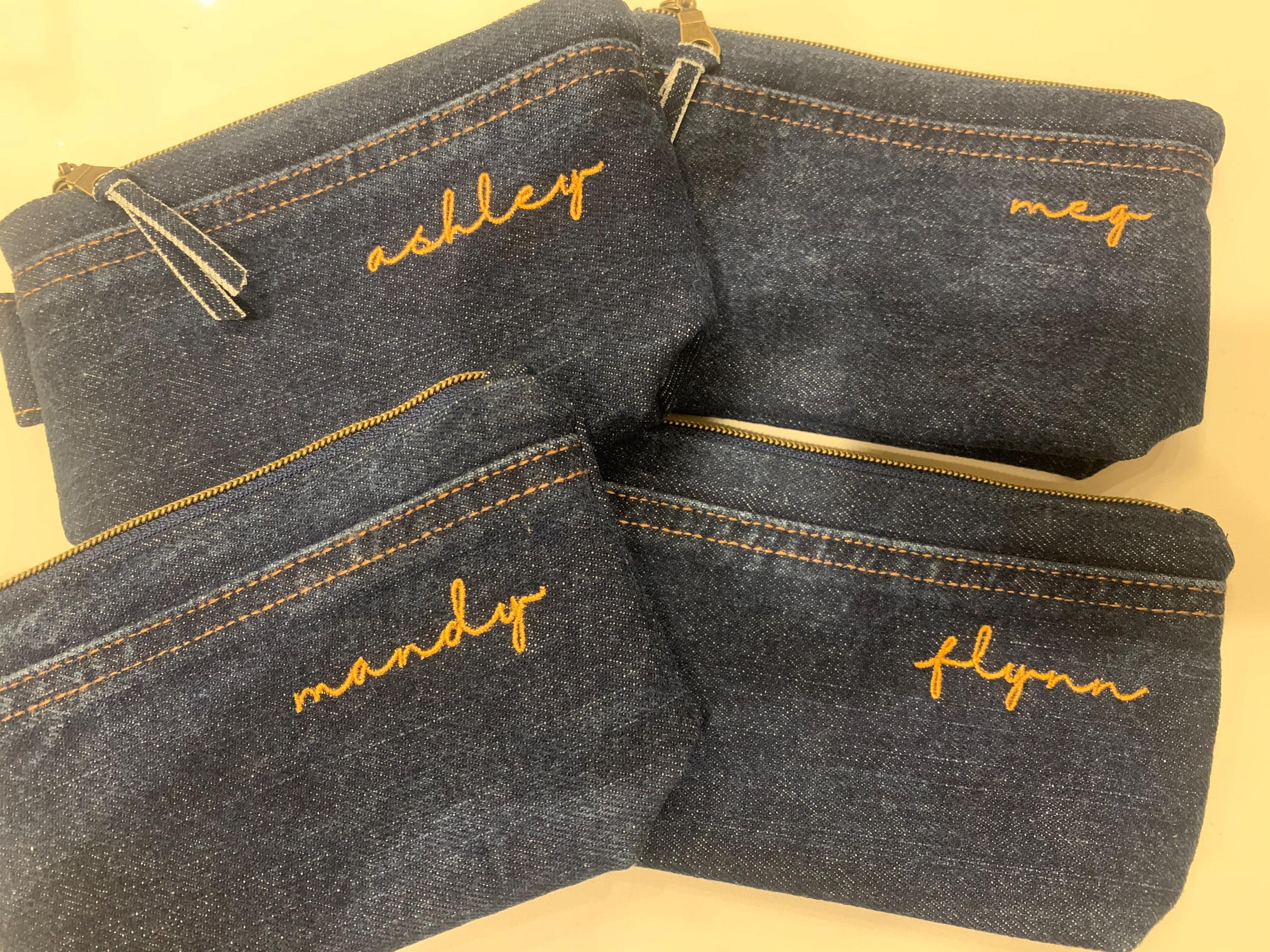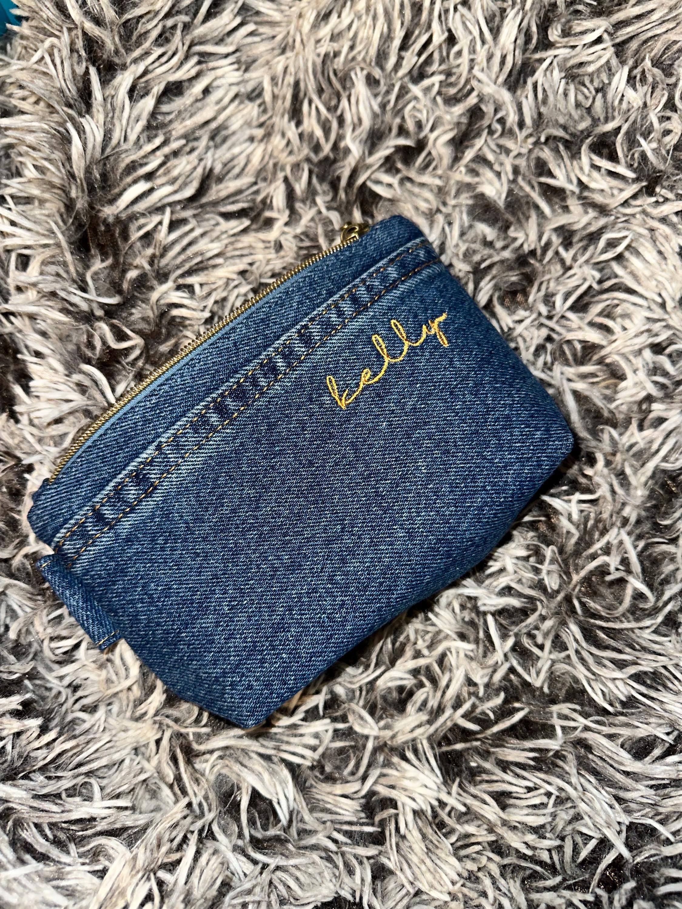 Personalized Upcycled Denim Zipper Pouch: Embroidered Makeup Bag Made From Real Jeans