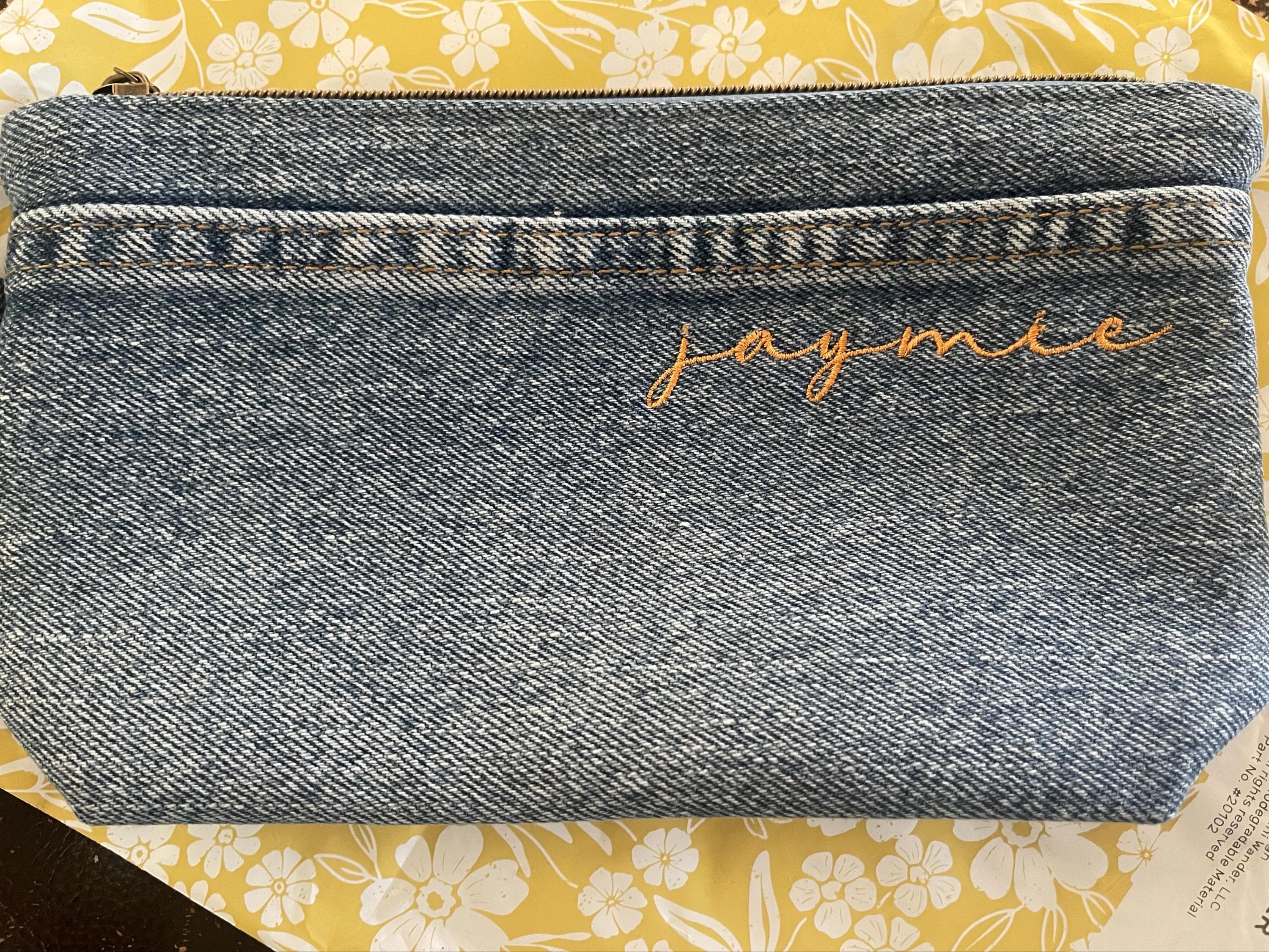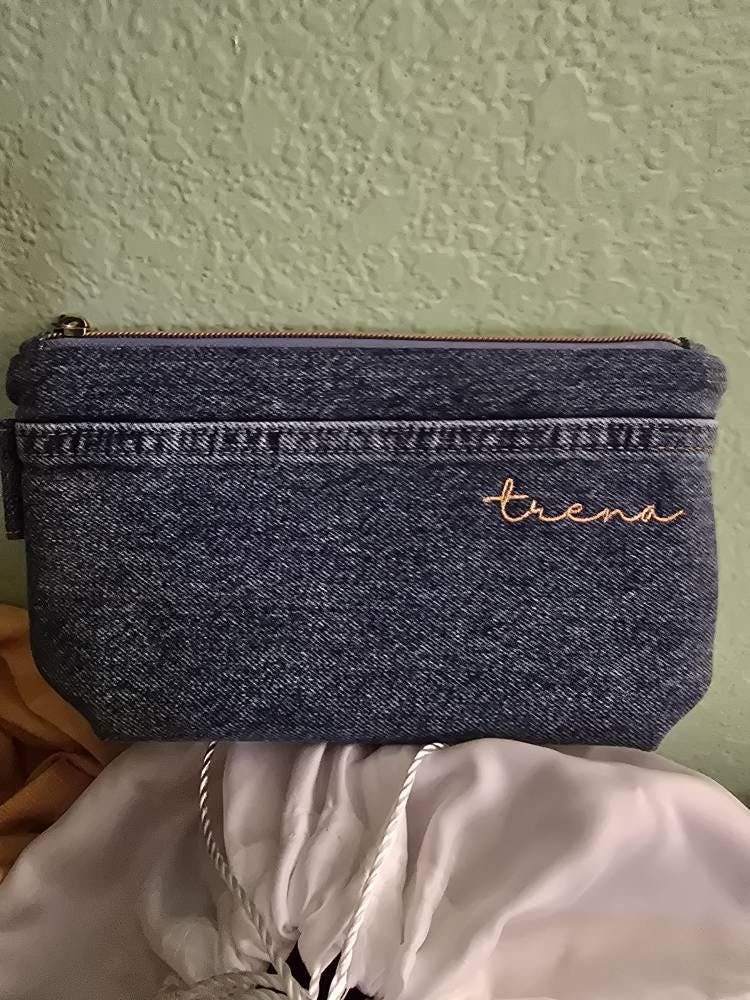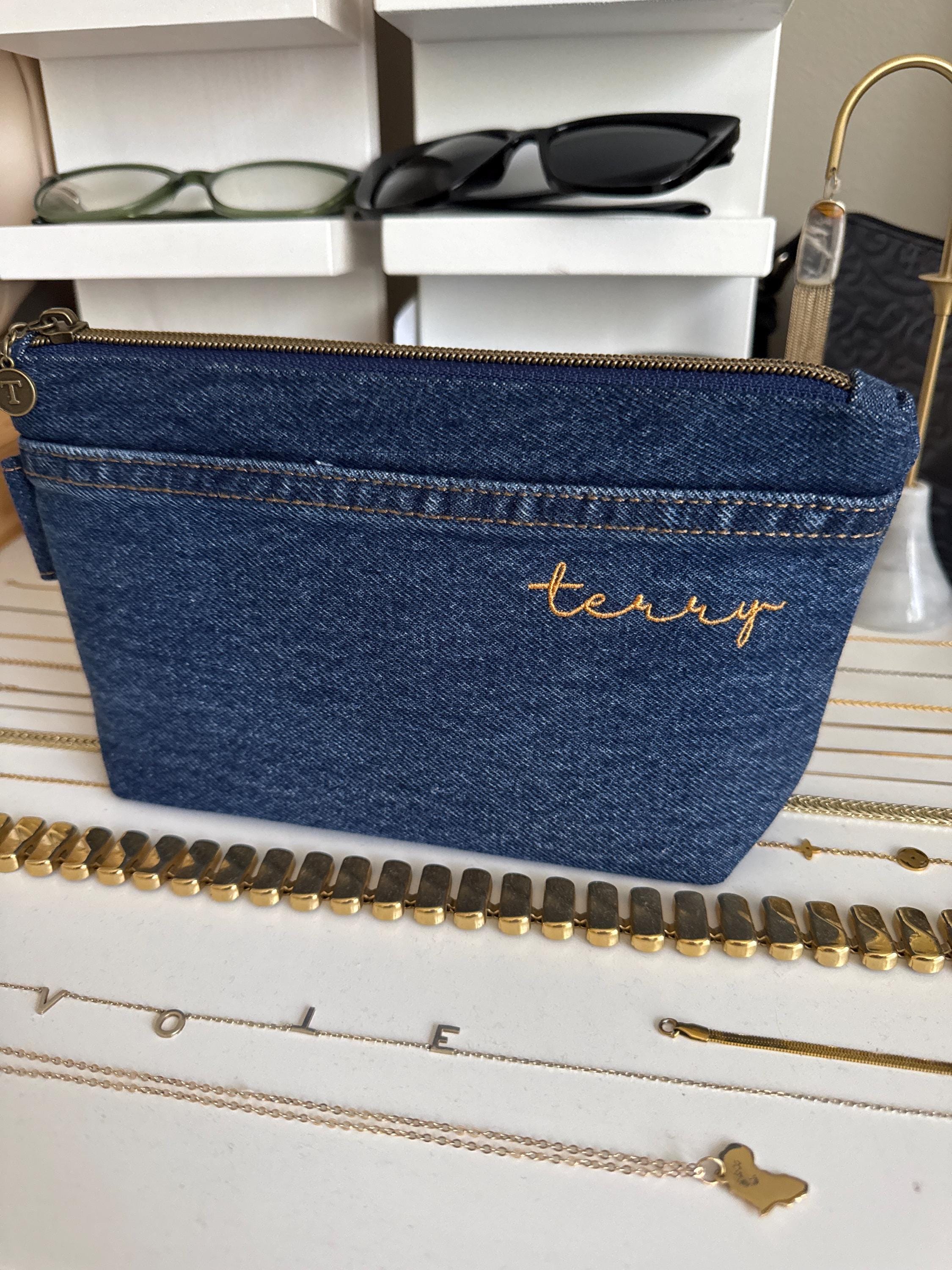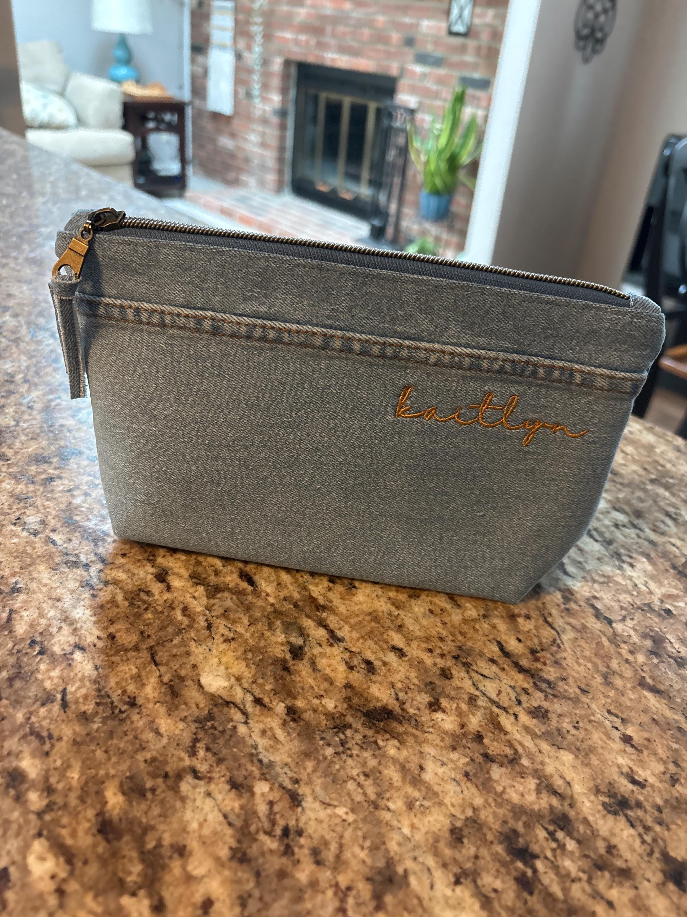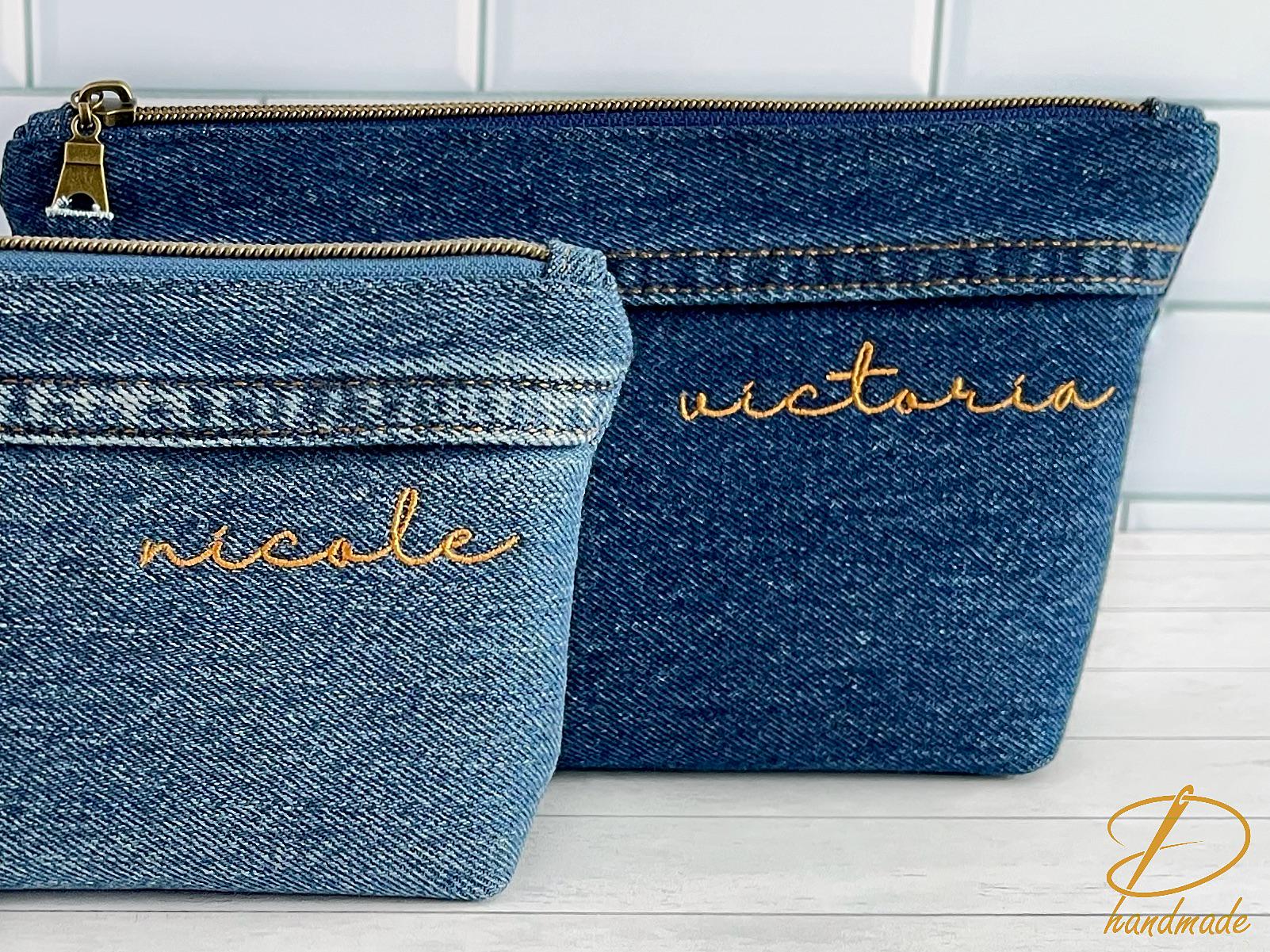 Personalized Upcycled Denim Zipper Pouch: Embroidered Makeup Bag Made From Real Jeans