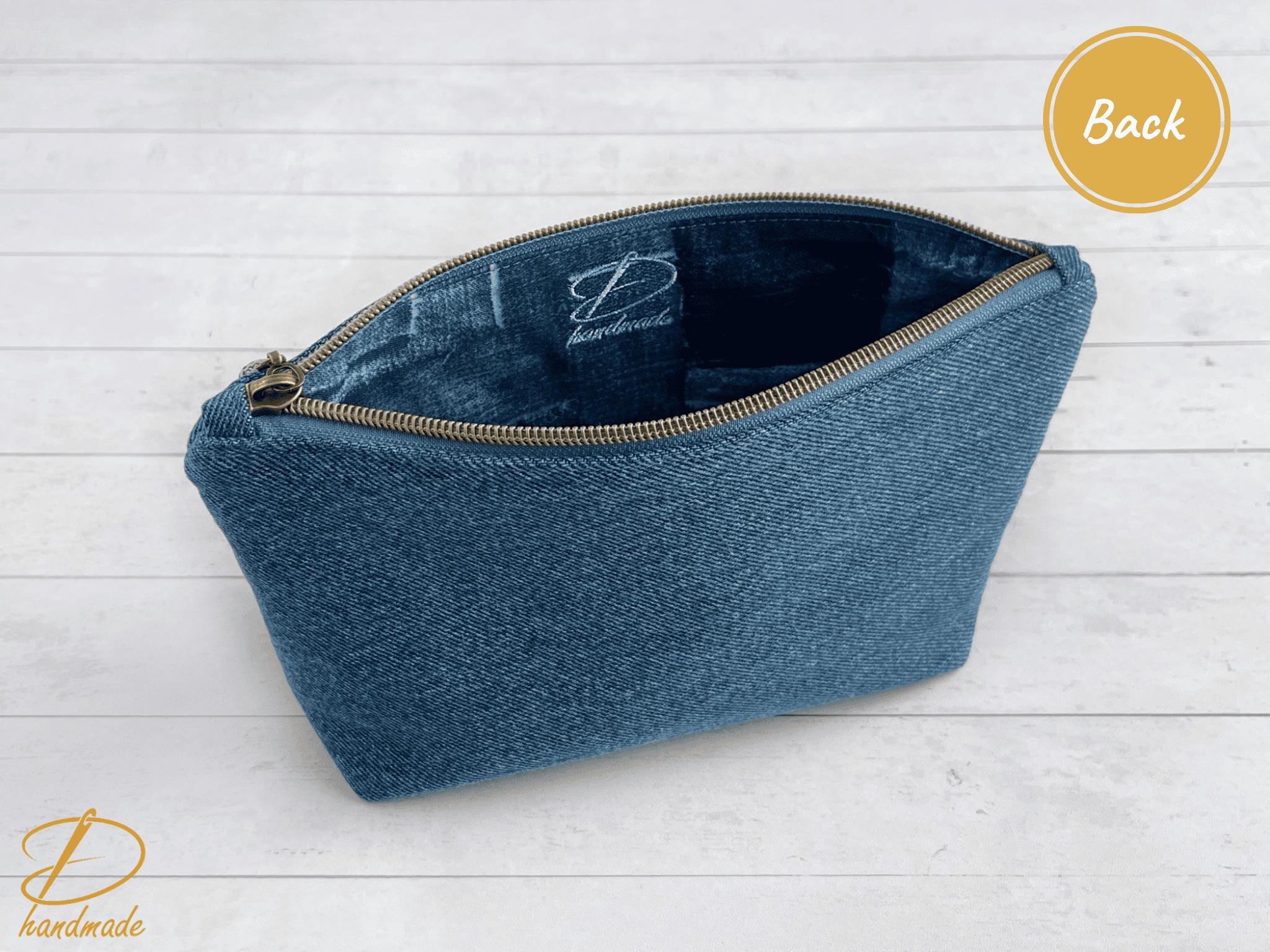 This bag is handmade in my studio out of repurposed denim from real jeans! The front of the pouch includes a decorative seam, the same seam that runs down the leg of your jeans! Your name can be embroidered on the front as well. The back is plain denim. The pouch is fully lined and has an antique bronze zipper with a denim zipper pull. You can choose from dark, medium, or light wash denim. Due to the variability of denim, colors may differ slightly than those pictured. The bag is flexible yet sturdy enough to stand up-right even when empty.