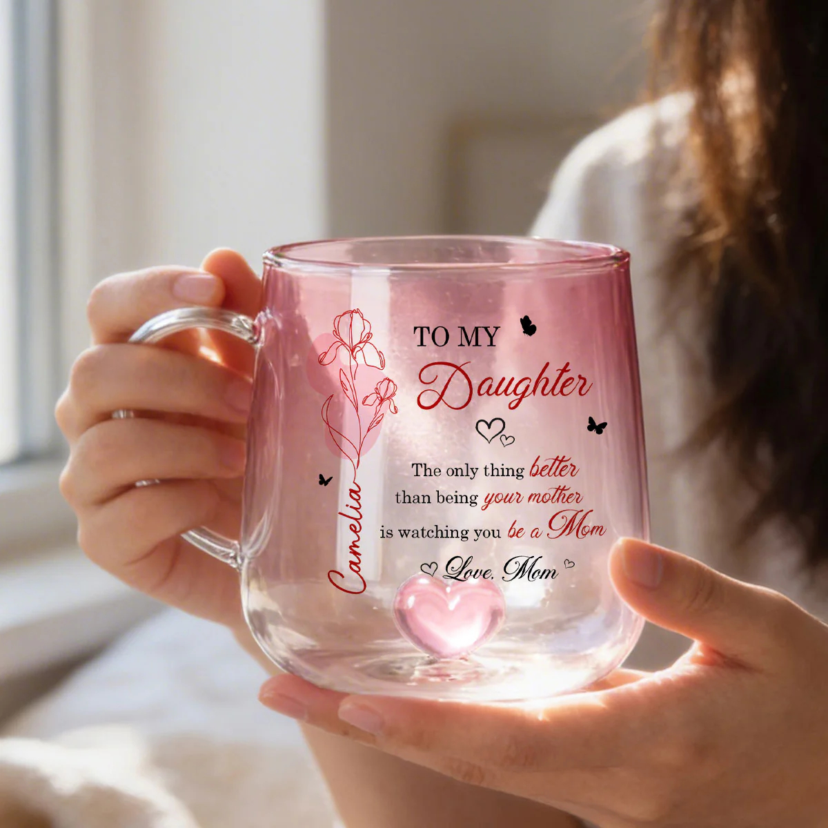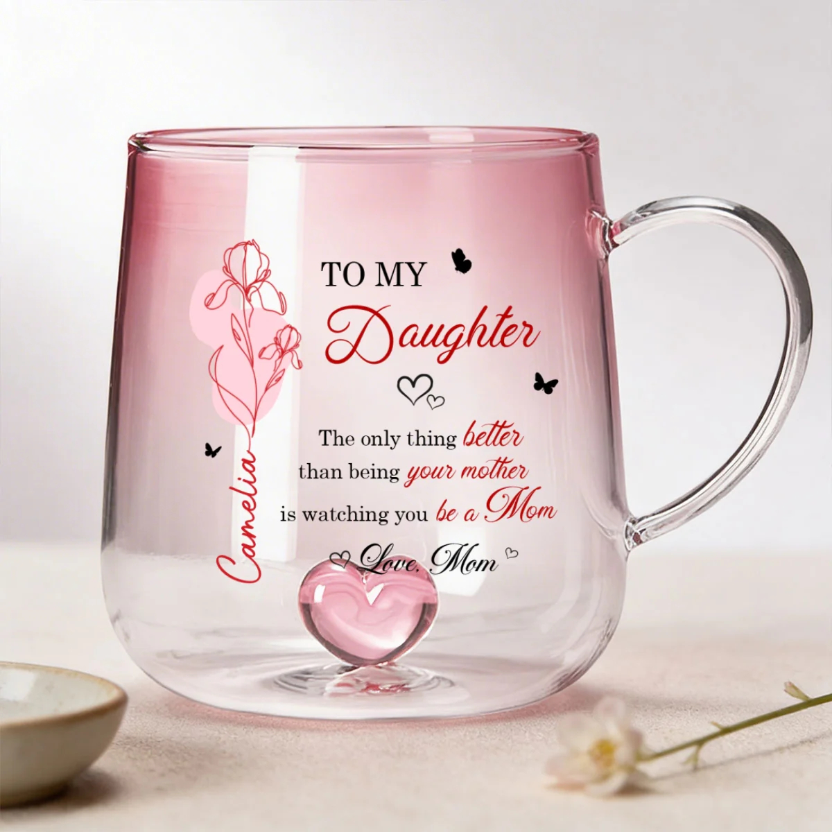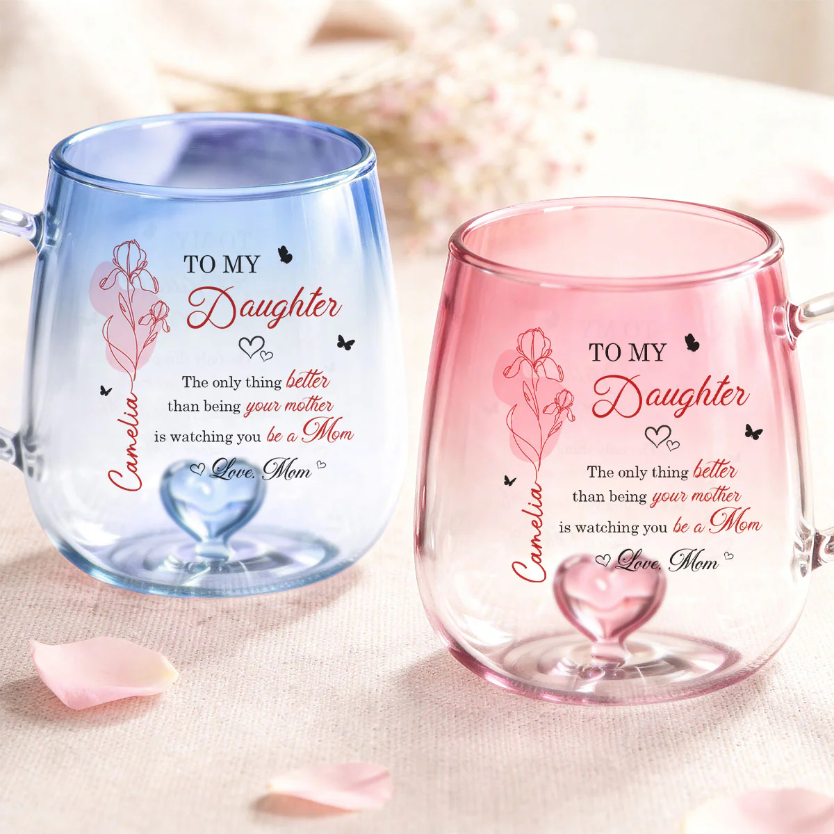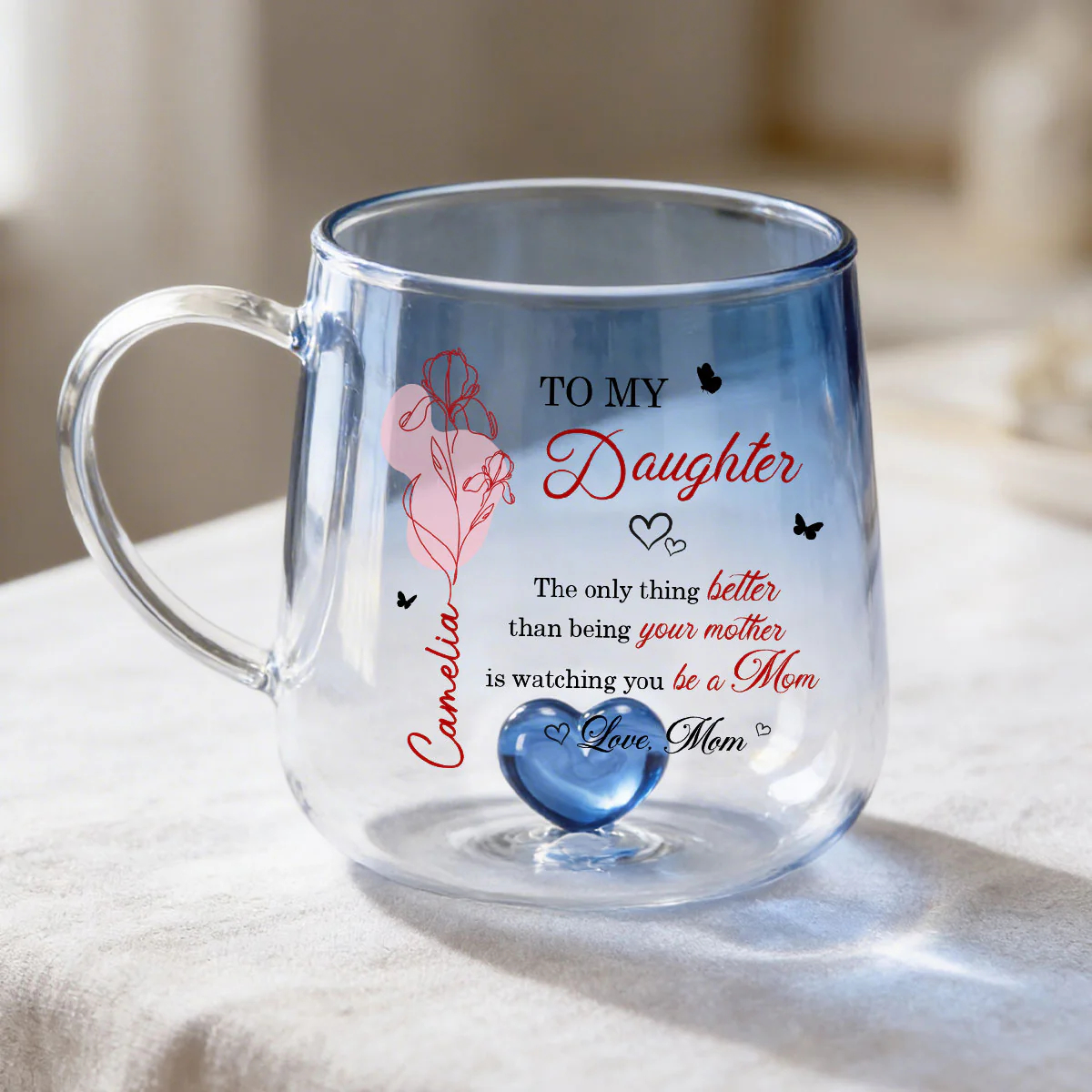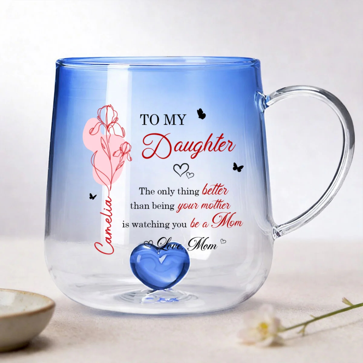 Celebrate the beautiful bond between mother and daughter with a gift that speaks straight to the heart. Available in two elegant color options—soft pink or calming blue—this personalized glass mug captures attention with its delicate floral design and meaningful message. Customized with her name and birth month flower, it becomes more than just a mug—it’s a heartfelt keepsake that honors her journey into motherhood. Whether she’s enjoying her morning coffee or unwinding with tea, this piece adds warmth, love, and a personal touch to every moment.