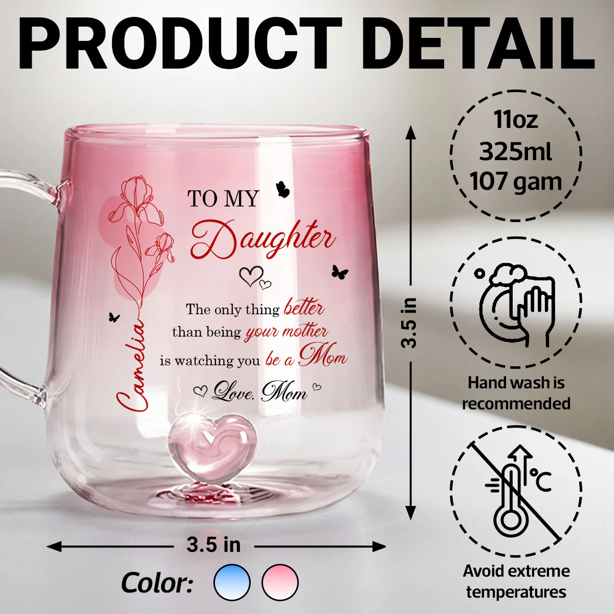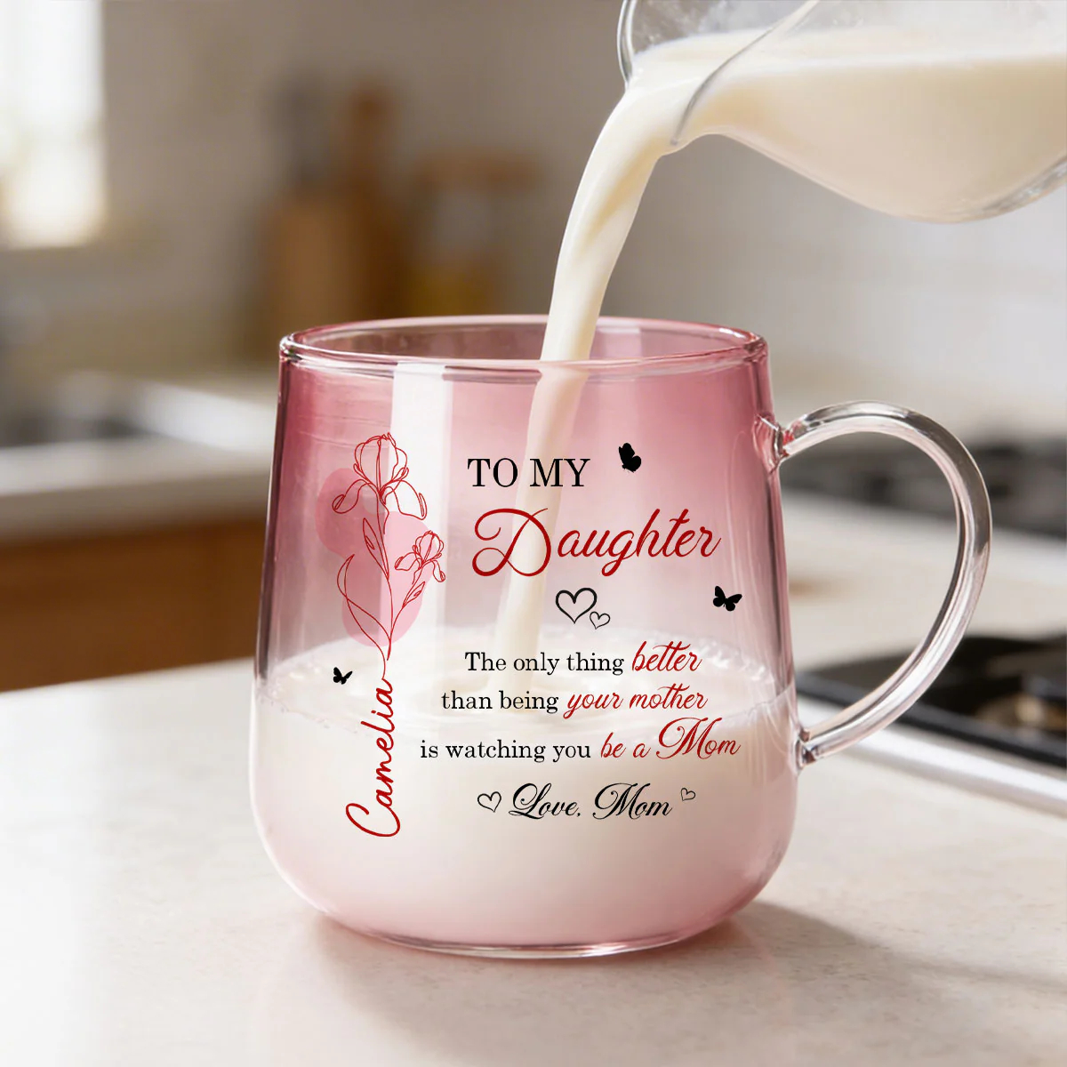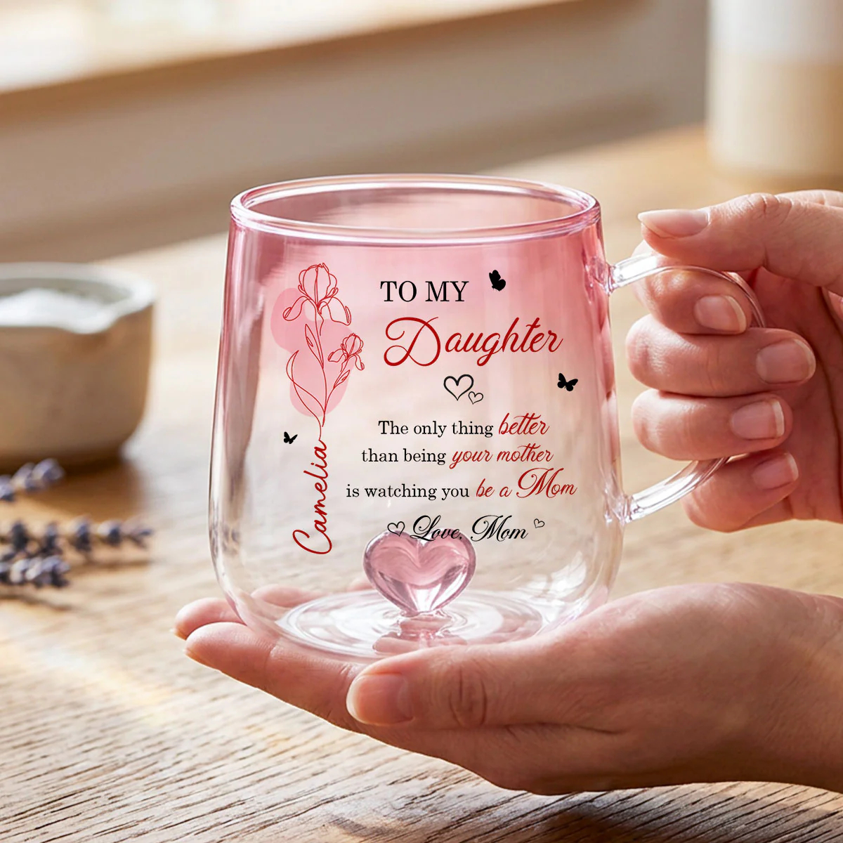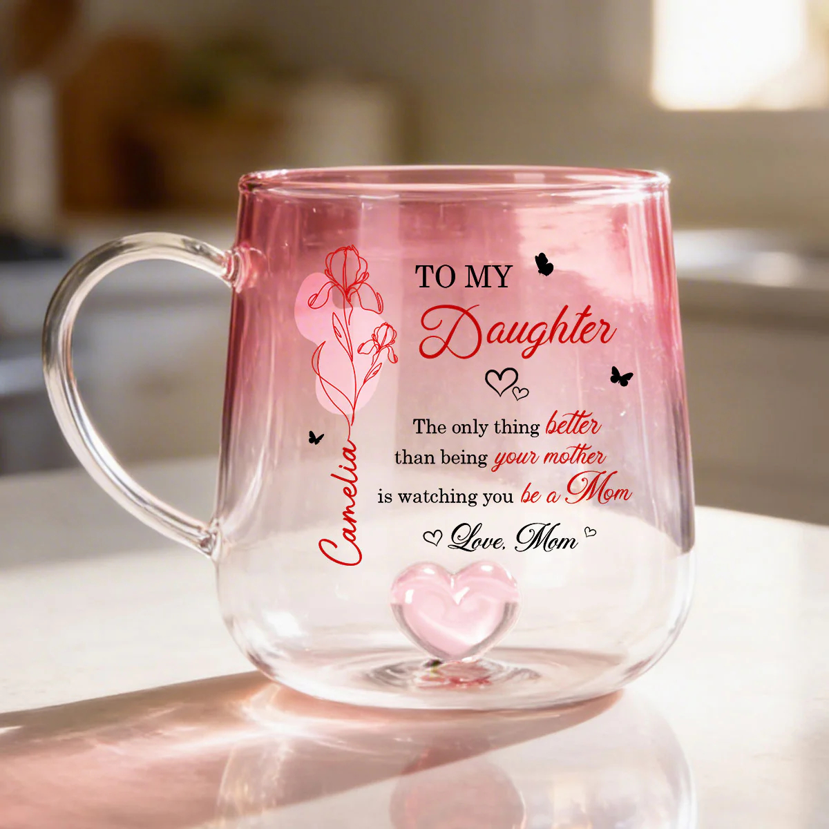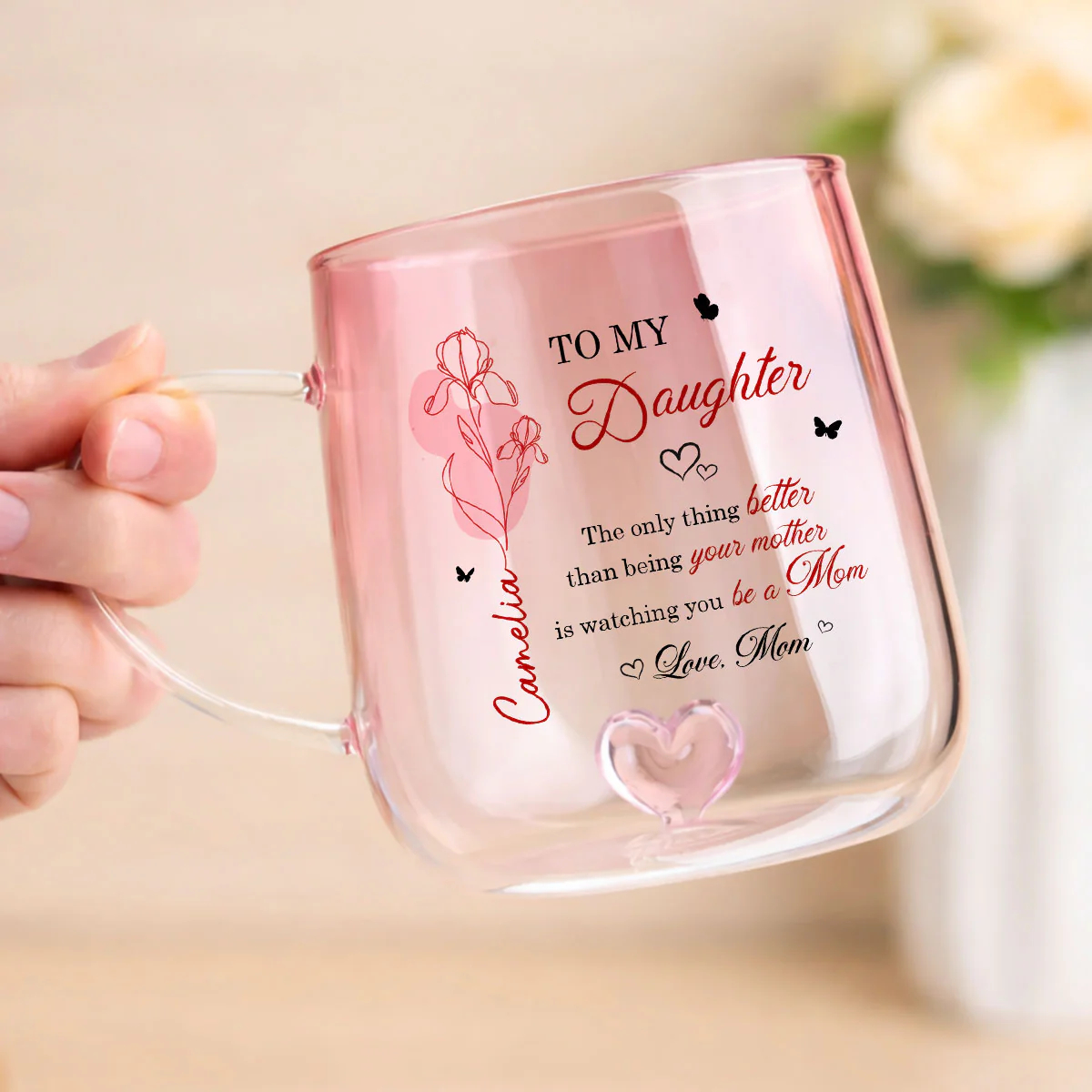 Celebrate the beautiful bond between mother and daughter with a gift that speaks straight to the heart. Available in two elegant color options—soft pink or calming blue—this personalized glass mug captures attention with its delicate floral design and meaningful message. Customized with her name and birth month flower, it becomes more than just a mug—it’s a heartfelt keepsake that honors her journey into motherhood. Whether she’s enjoying her morning coffee or unwinding with tea, this piece adds warmth, love, and a personal touch to every moment.
